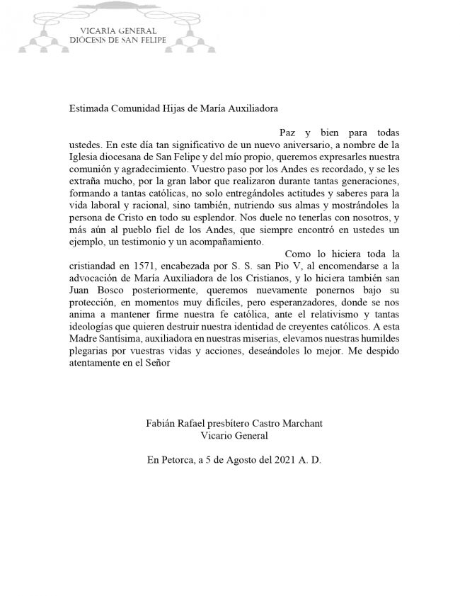 El Padre Fabián Castro Marchant envía de saludo a la comunidad de Hijas de María Auxiliadora con motivo de su aniversario, en el día de hoy con motivo de su…