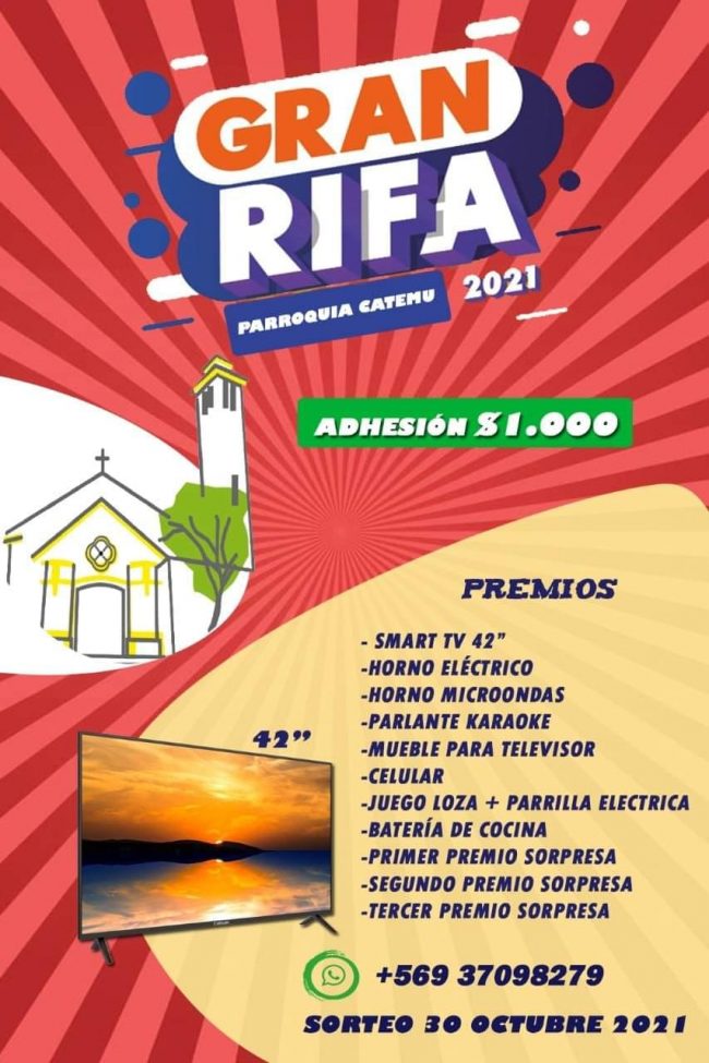 Parroquia San José de Catemu recuerda a su comunidad que está realizando su rifa parroquial, la que irá en beneficio de mejorar la Infraestructura de sus dependencias. «Para ello te…