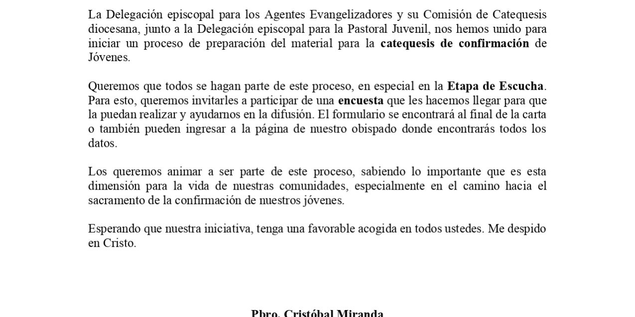 Los queremos animar a ser parte de este proceso, sabiendo lo importante que es esta dimensión para la vida de nuestras comunidades, especialmente en el camino hacia el sacramento de la confirmación de nuestros jóvenes.
