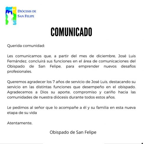 Informamos que por motivos y proyectos personales José Luis Fernández ya no trabajará en la Diócesis de San Felipe. Toda…