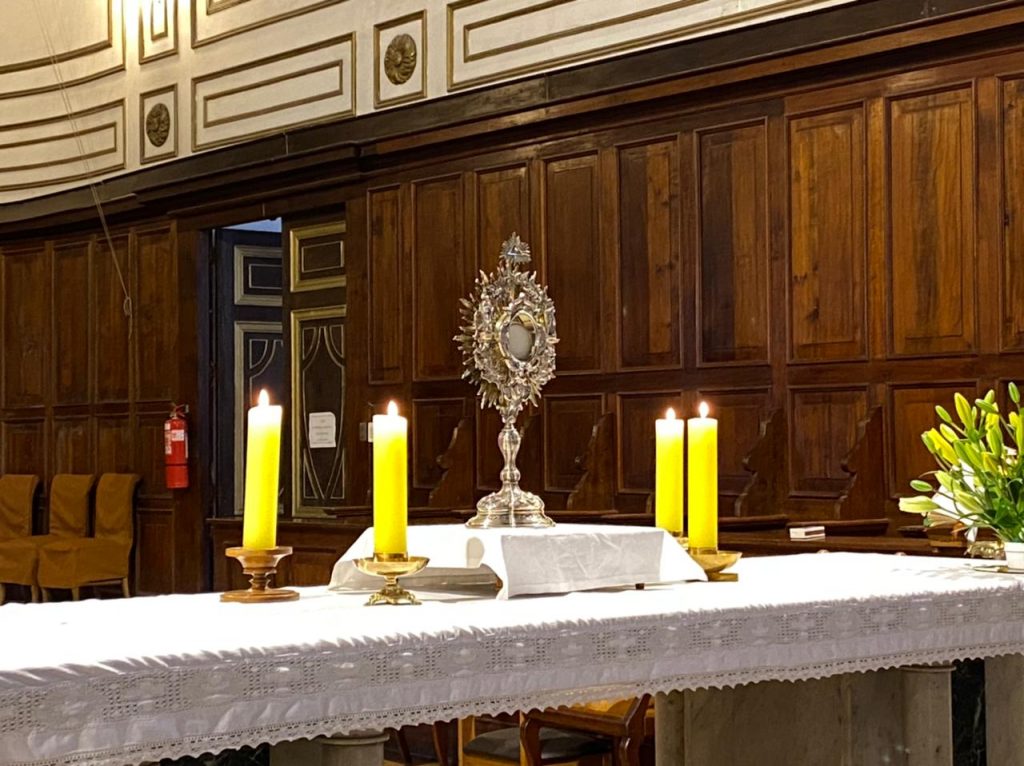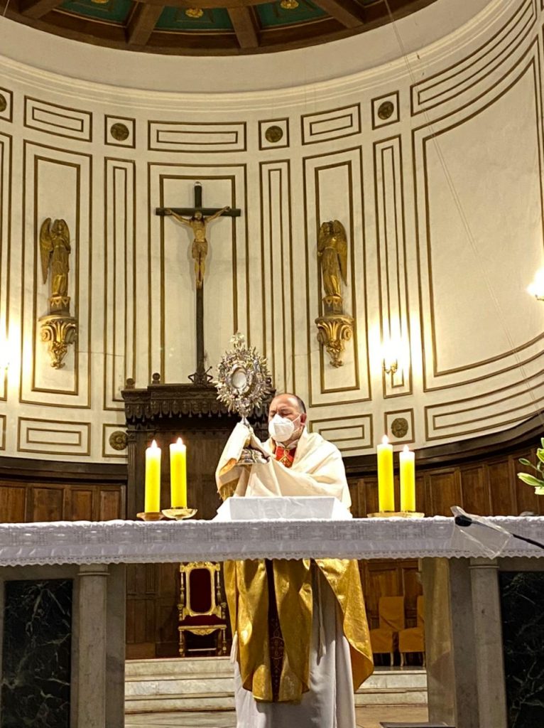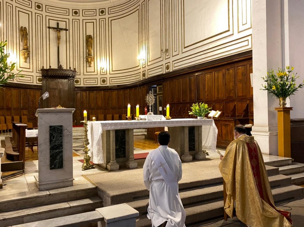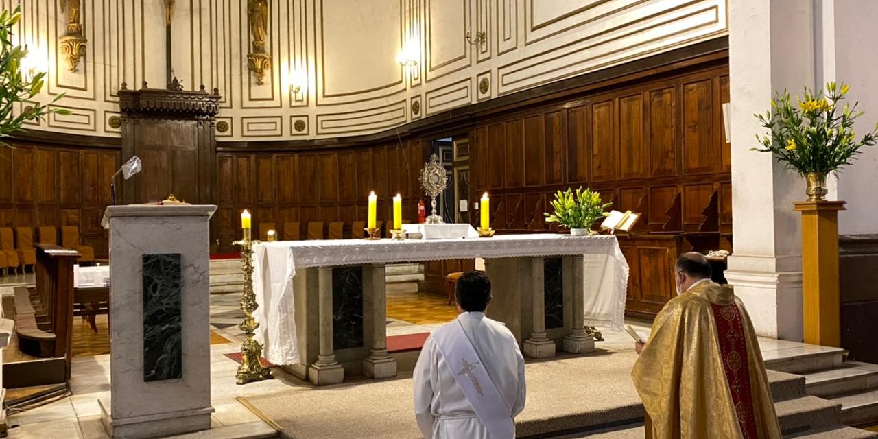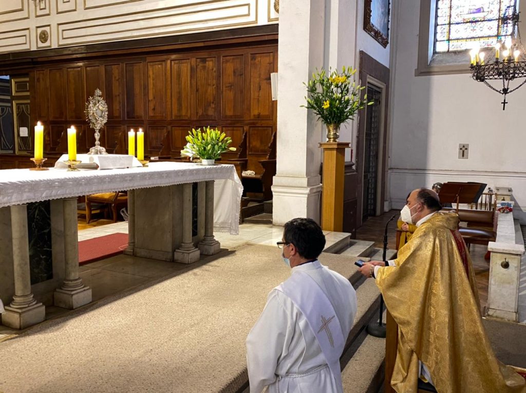 Al finalizar la Santa Misa se realizó la adoración al Santísimo para pedir especialmente por las personas afectadas por la pandemia, por los equipos de salud y también por los destinos de nuestro país en vista del nuevo proceso constituyente.