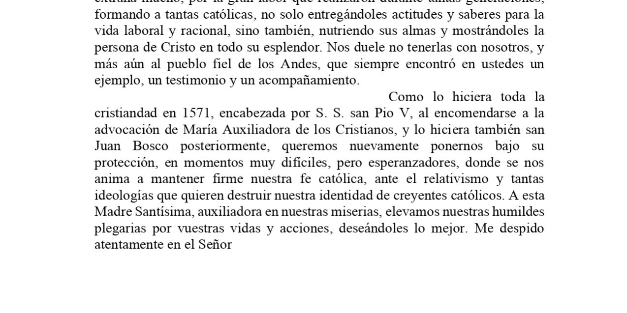 Paz y bien para todas ustedes. En este día tan significativo de un nuevo aniversario, a nombre de la Iglesia diocesana de San Felipe y del mío propio, queremos expresarles nuestra comunión y agradecimiento. Vuestro paso por los Andes es recordado, y se les extraña mucho, por la gran labor que realizaron durante tantas generaciones, formando a tantas católicas, no solo entregándoles actitudes y saberes para la vida laboral y racional, sino también, nutriendo sus almas y mostrándoles la persona de Cristo en todo su esplendor. Nos duele no tenerlas con nosotros, y más aún al pueblo fiel de los Andes, que siempre encontró en ustedes un ejemplo, un testimonio y un acompañamiento.