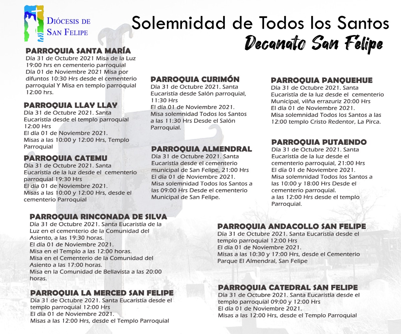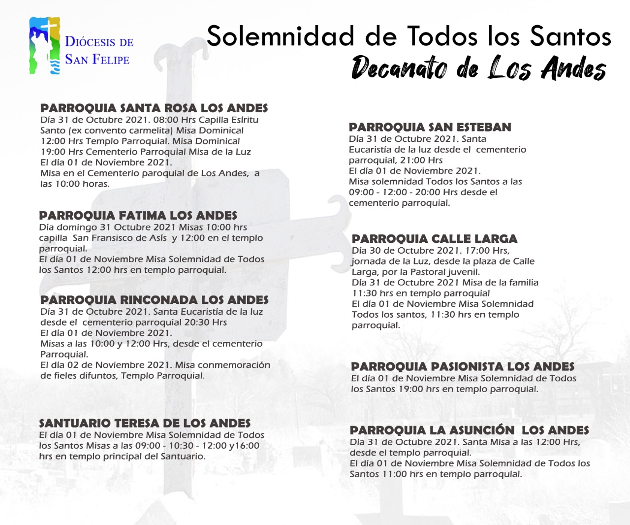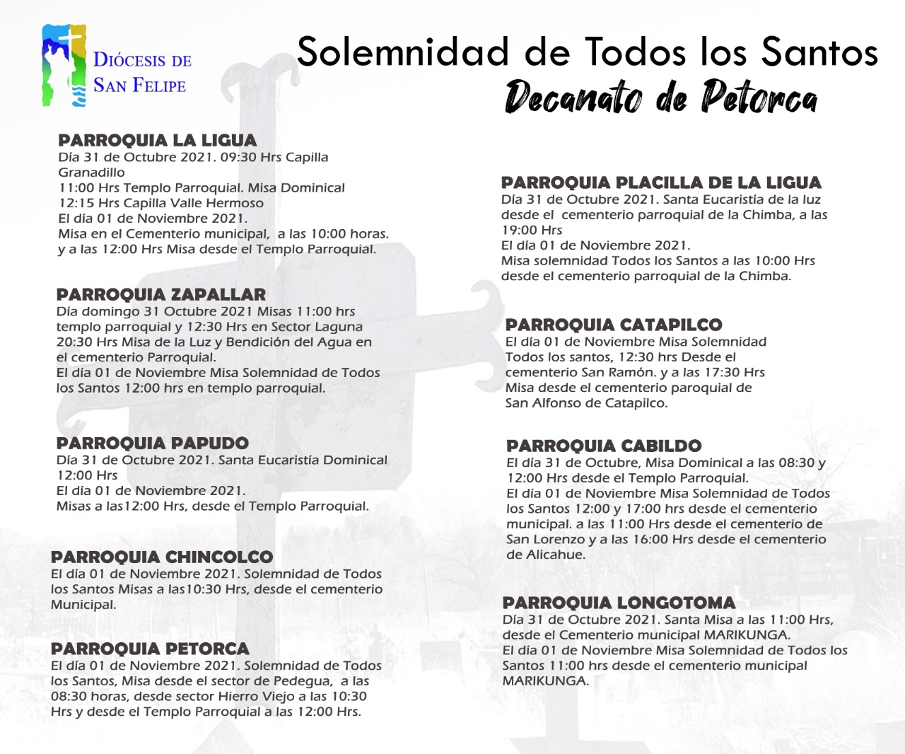 Las comunidades parroquiales de los decanatos de Petorca, San Felipe y Los Andes, invitan a las diferentes liturgias y celebraciones para el próximo lunes 1 de noviembre, Solemnidad de Todos Los Santos.
